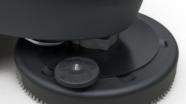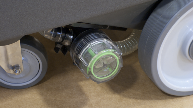 Solution water filter and solenoid valve (battery model only). Easy access to the battery compartment. Quick drain and easily inspectable recovery tank. Non-marking wheels. Roto-molded polyethylene tanks, shock and acid resistant. The lower tank also serves as battery compartment. Low noise operation thanks to the protected positioning of vacuum motor. Powerful gearmotor; metal brush plate with integrated plastic splash guard/bumper.