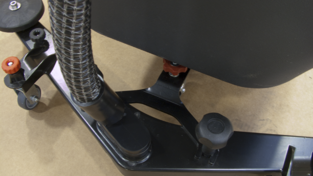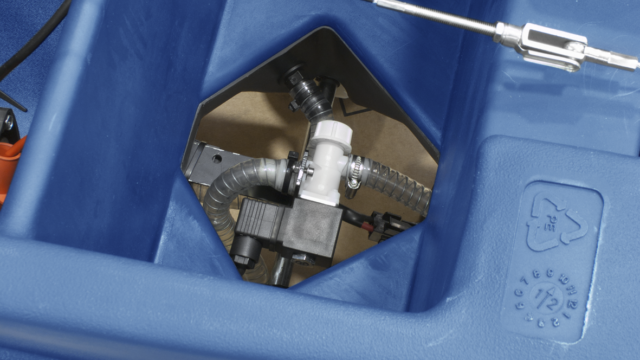 The outflow of the detergent solution is controlled by a solenoid valve. The actuation of the solenoid valve is operated by the control lever, avoiding the detergent solution outflow when the brush is stopped during the interruptions of work. Renovated squeegee with new pressure adjusting system. The squeegee blades are easily replaceable without the use of tools. Quick and easy squeegee coupling through the two large knobs; the squeegee is released without any damage in the event of accidental impact.